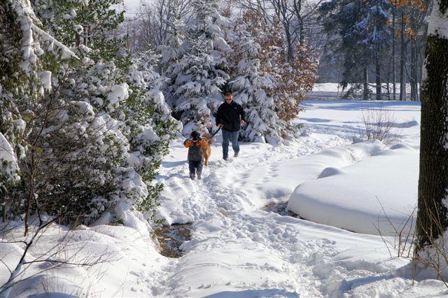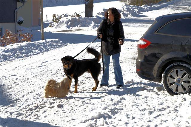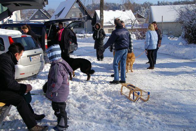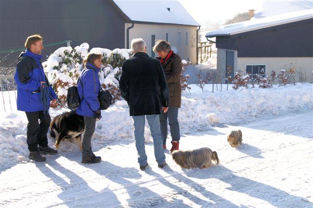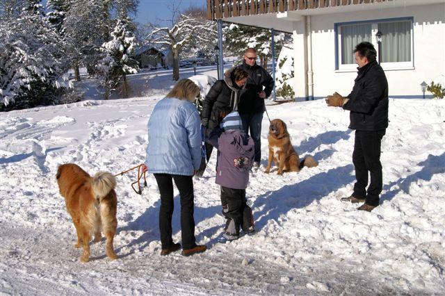 Winterspaziergang in Meinerzhagen Der alljährliche Winterspaziergang iim Sauerland ist mittlerweile fester Bestandteil des FKT Terminkalenders. In diesem Jahr allerdings zum ersten Mal mit Schnee, der jedoch so reichlich vorhanden war, daß er für die vorangegangenen Jahre gleich mitgereicht hätte. Die Kinder brachten also gleich ihre Schlitten mit, und jedermann hatte seinen Spaß, vor allem unsere Do Khyi und auch die kleinen Tibeter, die fast im tiefen Schnee versanken. Nach der anstrengenden Schneewanderung hatte man sich ein kalorienreiches Essen und einen heißen Kakao dann auch reichlich verdient.
